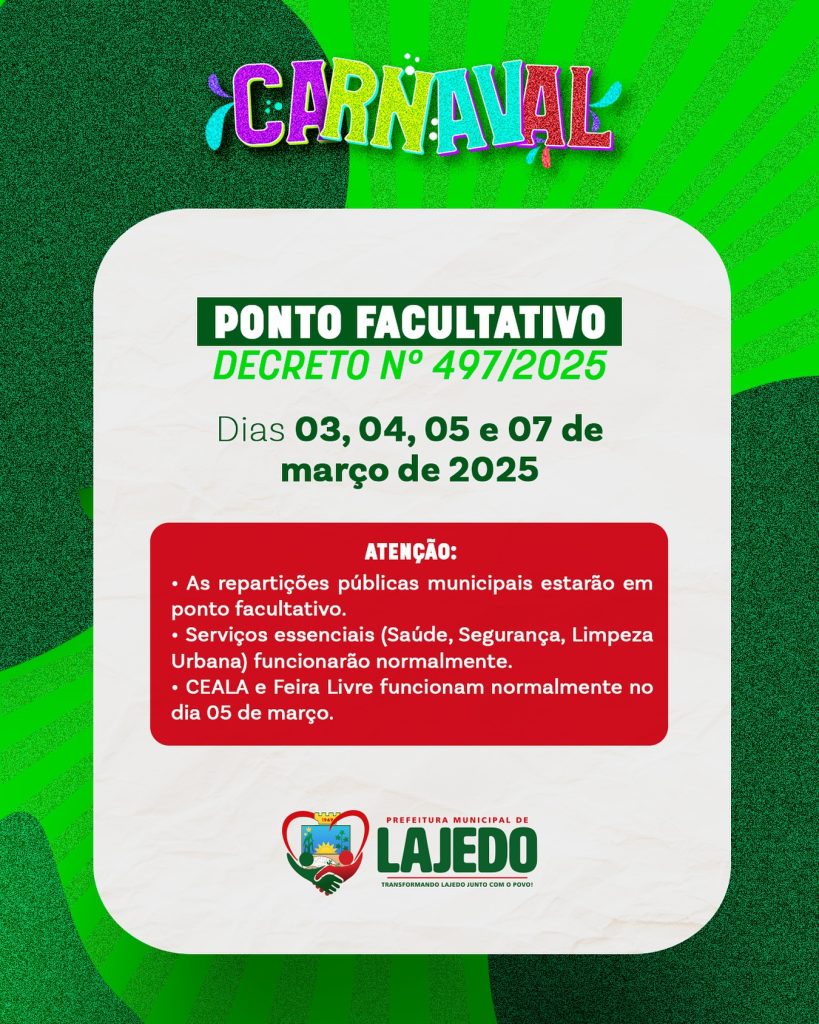 A Prefeitura torna público o decreto a respeito das datas de ponto facultativo na semana do Carnaval. A Secretaria de Administração chama atenção para as datas e dias em que o serviço público funcionará e não funcionará, em acordo com o calendário estadual, com feriado e datas comemorativas. Prefeitura Municipal, Transformando Lajedo junto com o […]