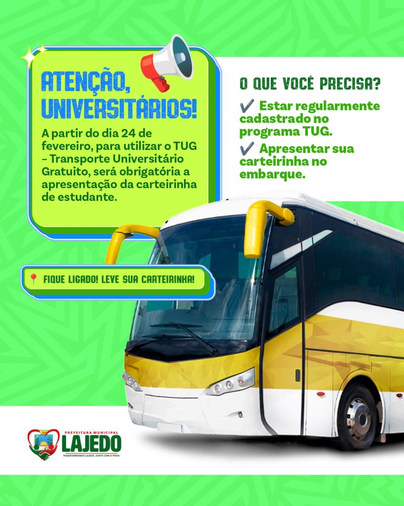A partir do dia 24/02, para utilizar o Transporte Universitário Gratuito (TUG), será obrigatória a apresentação da carteirinha de estudante. O que você precisa? Estar regularmente cadastrado no programa TUG; Apresentar sua carteirinha no embarque. https://globosoft.com.br/tug Prefeitura Municipal – Transformando Lajedo junto com o povo!