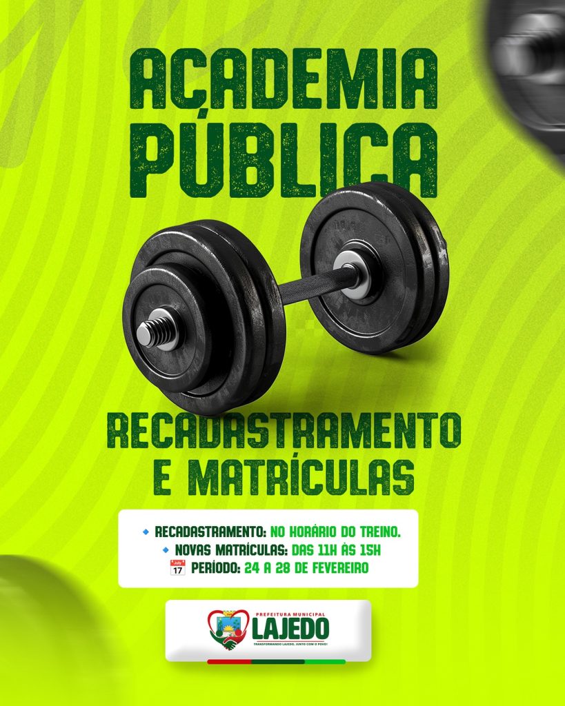 A Prefeitura de Lajedo, por meio da Secretaria de Cultura, Esporte, Turismo e Lazer informam que a partir de segunda-feira estarão abertas as matrículas e o recadastramento para quem utiliza o serviço da Academia Pública. Quem já é matriculado, o recadastramento é feito: no horário do treino; Novas matrículas: 11h às 15h Atenção! As matrículas […]