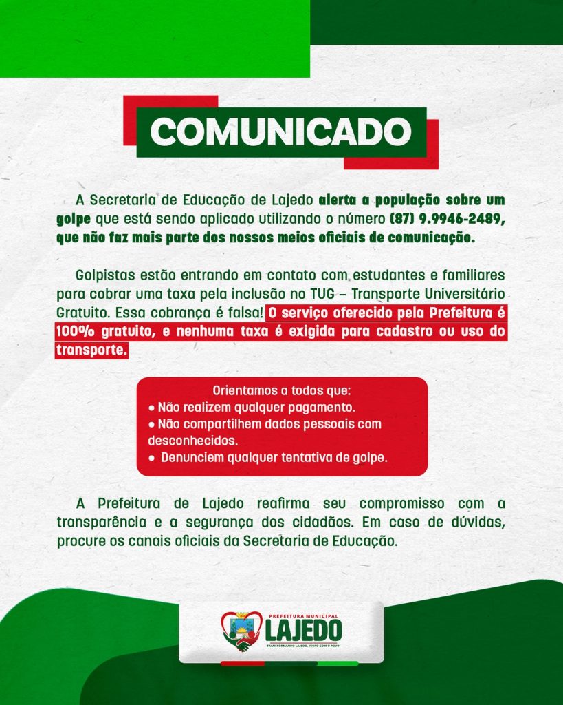 A Secretaria de Educação de Lajedo alerta a população sobre um golpe que está sendo aplicado utilizando o número (87) 9.9946-2489, que não faz mais parte dos nossos meios oficiais de comunicação. Golpistas estão entrando em contato com estudantes e familiares para cobrar uma taxa pela inclusão no TUG – Transporte Universitário Gratuito. Essa cobrança […]